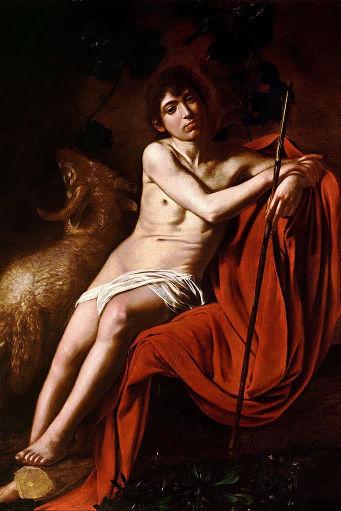 Johannes de Doper werd afgebeeld op minstens acht Caravaggio-schilderijen. Deze toont een jongen op een donkere achtergrond, waarachter een schaap op bruine druiven kauwt. De jongen is attent: misschien is het Johannes die aan het naderende offer van Christus denkt. Of misschien verveelde het echte kind dat van de straat is geroepen om een paar uur model te zijn, zich gewoon.