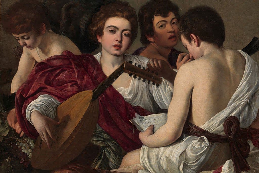 Drie jonge mannen in theatrale kostuums zitten en bereiden zich voor op de repetitie. In het midden trekt Mario Minniti de luitsnaren omhoog, de violist kijkt goed naar de noten. Tussen hen in is er Caravaggio zelf met een hoorn. Links staat Amoer met pijlen achter zijn rug, bezet door druiven. Er zijn verschillende interpretaties van dit beeld.