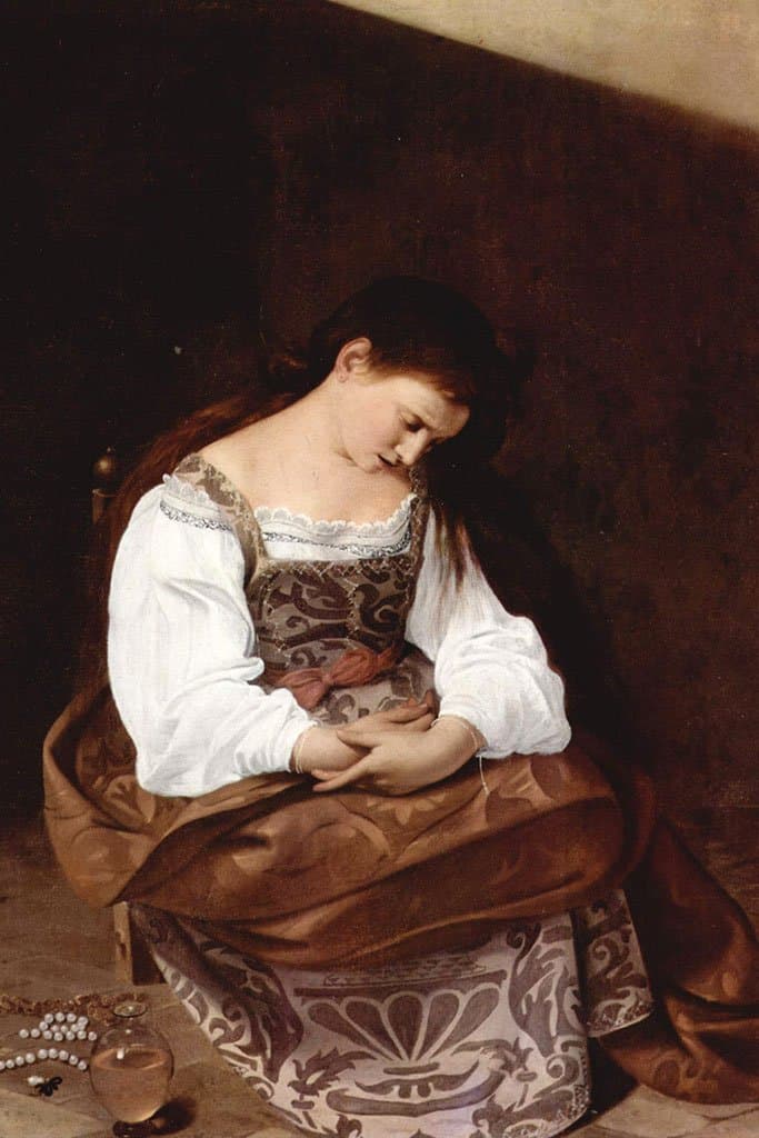 Caravaggio toont meesterlijk de emoties van Magdalena. Ze vouwde haar armen voor haar armen. Het hoofd van de voormalige hoer is gekanteld, zijn ogen zijn gesloten. Het is echter niet te lezen in haar beeld van berouw. Integendeel, er is een grote nederigheid met leven, vermoeidheid en onheil.