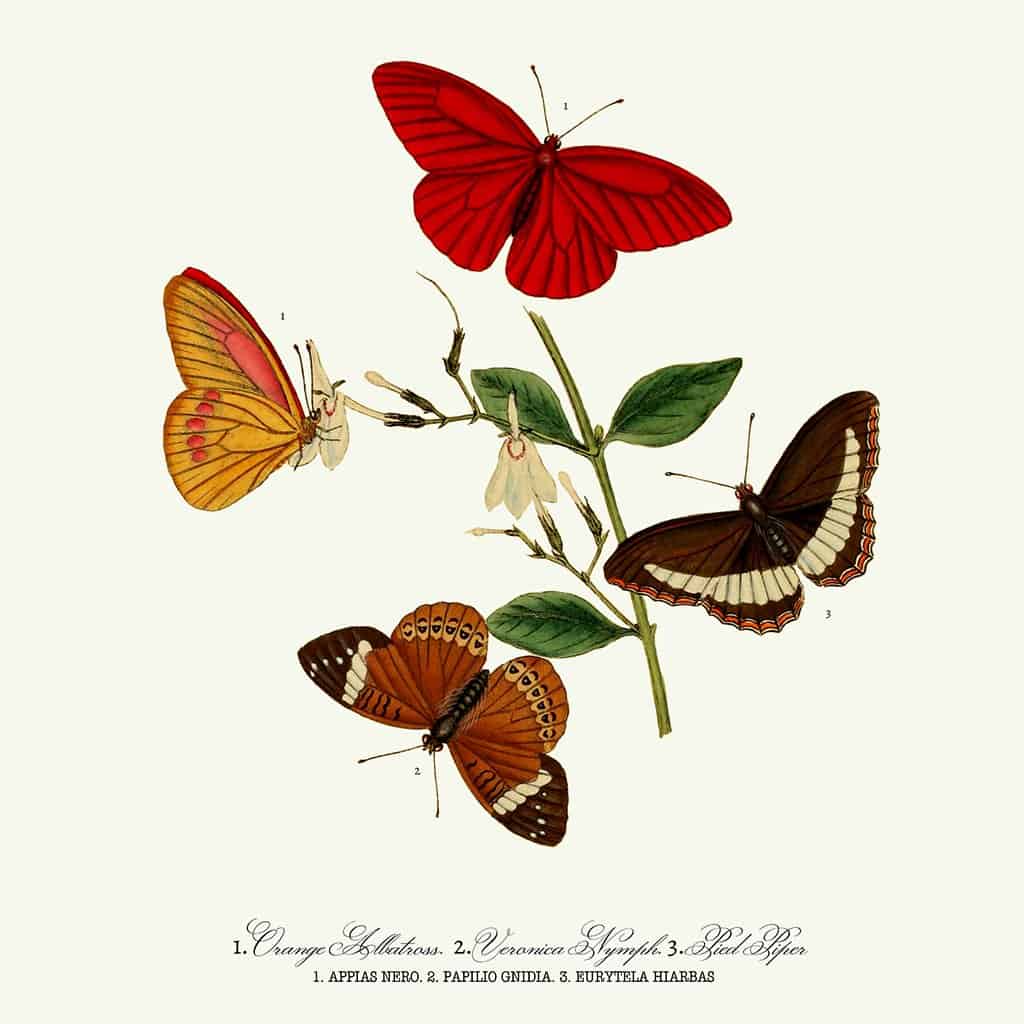 Deze ongelooflijke vintage illustratie met vlinders toont zulke insecten: Palm Dart Oranje albatros (Appias nero), Veronica nimf (Papilio Gnidia) en Bonte Pijper (Eurytela hiarba's).