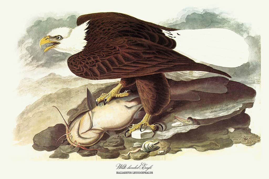 Een schilderij van witharige adelaar (Haliaeetus Leucocephalus) door John James Audubon. Deze ornitholoog en naturalist heeft tijdens zijn leven 25 nieuwe soorten geïdentificeerd. Het trieste feit van Audubon is dat hij elke vogel die hij schilderde heeft geschoten en gedood.