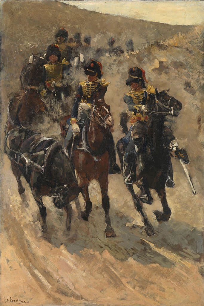 De elite 'Yellow Riders' galoppeert in razend tempo door de duinen. Breitner maakte optimaal gebruik van hun zwart-rode busbies en de gouden vlecht op hun uniformen. De herhaling van deze kleuraccenten versterkt de dynamiek van de beweging. Het zand dat door de paarden aan de voorkant wordt opgeworpen, vertroebelt het uitzicht van de ruiters erachter. Het enige wat overblijft zijn de accenten van zwart, geel en rood.