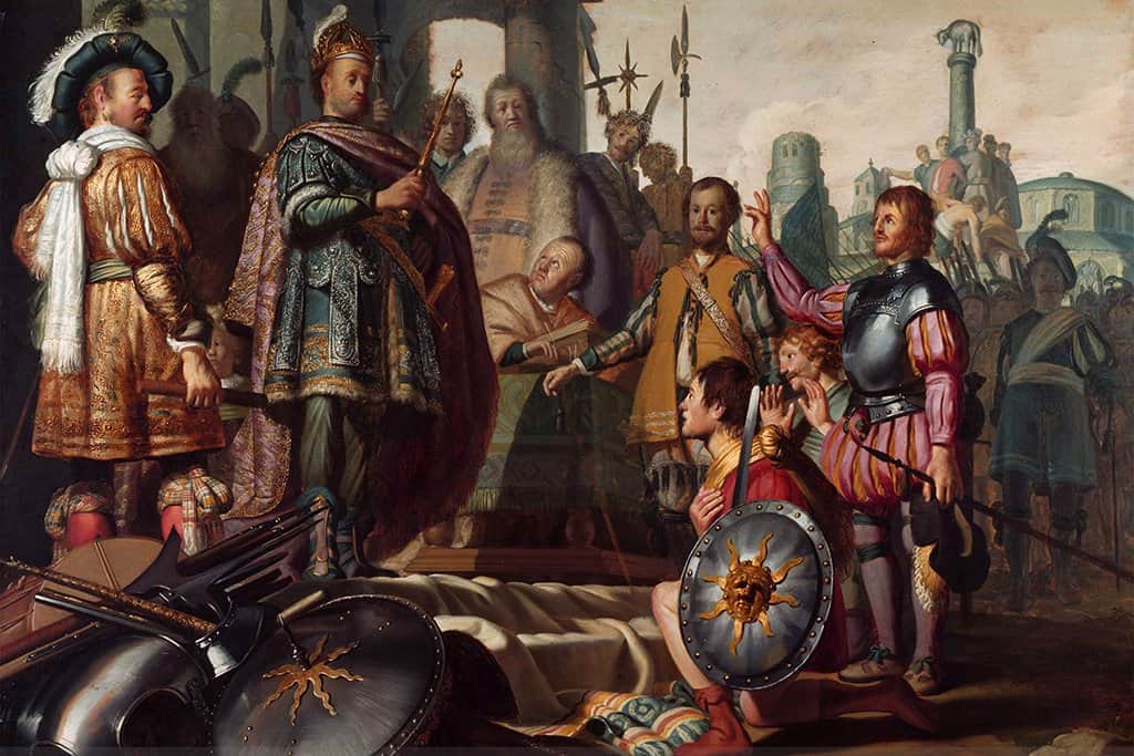 Het is niet duidelijk welke voorstelling Rembrandt hier precies heeft afgebeeld. Er zijn meer dan een dozijn onderwerpen voorgesteld, variërend van Bijbelse thema's tot klassieke en moderne geschiedenis. Lange tijd werd aangenomen dat de Consul Cerialis en de Germaanse legioenen vertegenwoordigde. Huidige kunsthistorici gaan er echter van uit dat dit de gelofte van de drie Horaten voor de Romeinse koning Tullus Hostilius is.