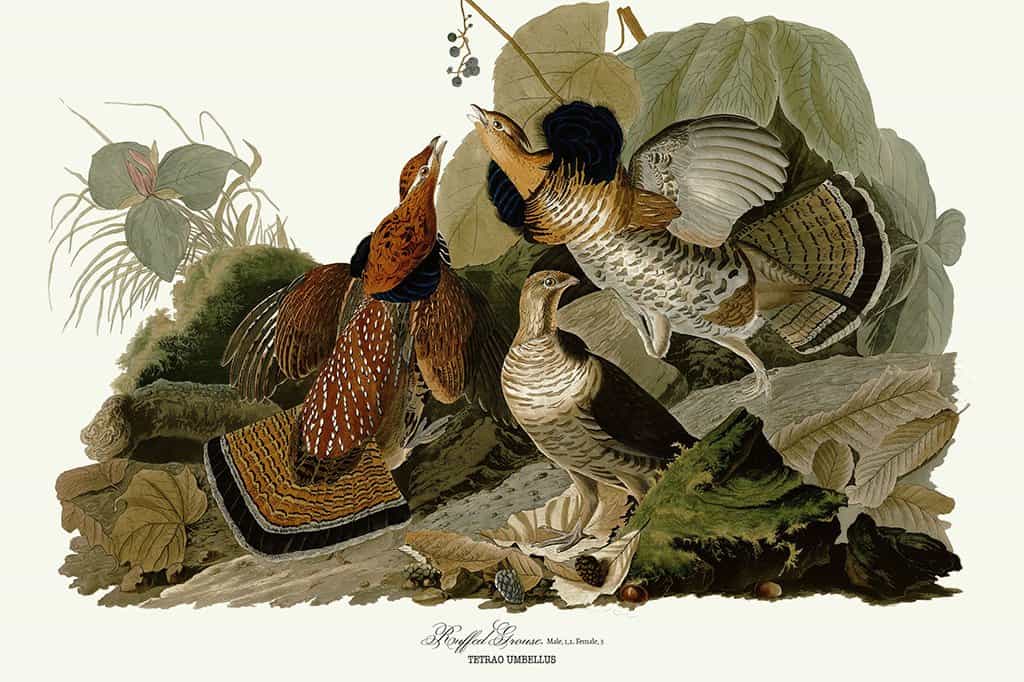 Een illustratie van het korhoen (Tetrao Umbellus) van de grote Amerikaanse ornitholoog John James Audubon. Hij reisde door de V.S. en registreerde 435 levensgrote beelden van elke inheemse vogel in het land, dat hen in natuurlijke houdingen in hun inheemse habitat afschildert.