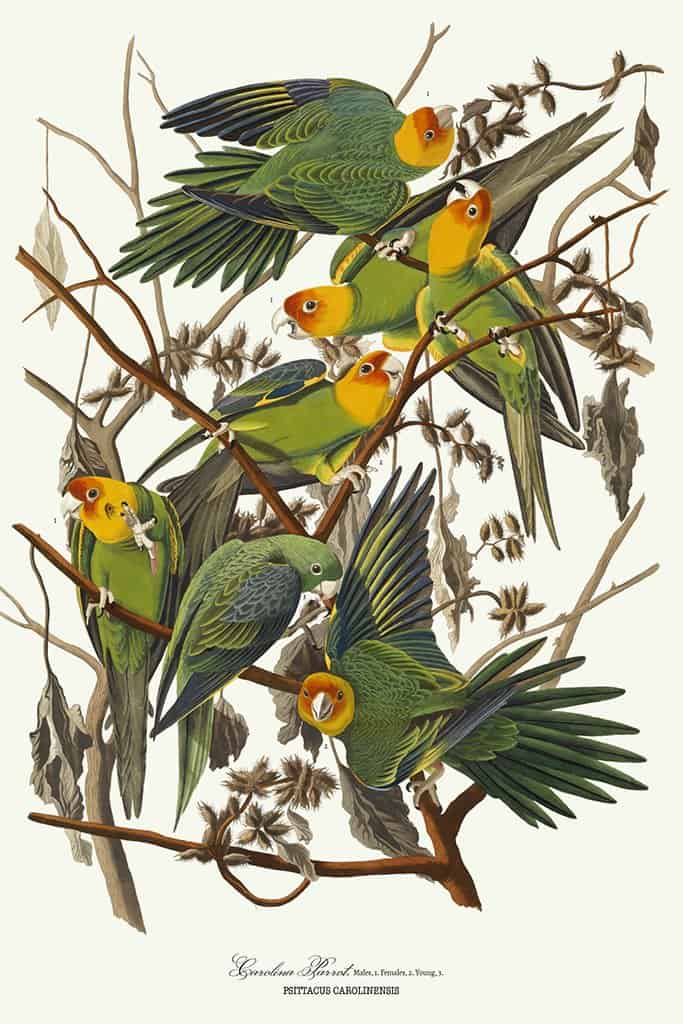 Deze prachtige vintage illustratie toont Carolina papegaaien (Psittacus Carolinensis). Deze schattige vogels met een felgele kop, een rood-oranje gezicht en een bleke snavel woonden vroeger in de VS. Helaas zijn ze vandaag de dag volledig uitgestorven.