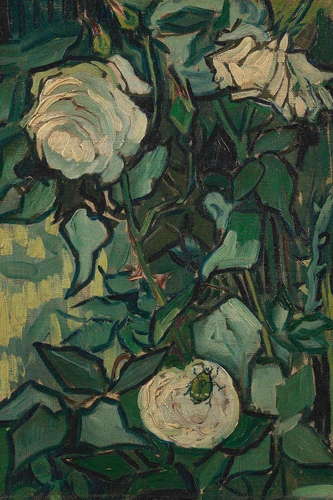 De rozen in dit schilderij waren oorspronkelijk niet wit maar roze. Je kunt een hint van die kleur zien. Dat is veranderd omdat een pigment in verf in de loop van de tijd is vervaagd. Op een blad eronder zit een insect, veel nauwkeuriger geschilderd dan de rest van het schilderij. Het is een gouden kever (Cetonia aurata). Van Gogh had de kever al eerder geschetst. Waarschijnlijk heeft hij hier op getekend.