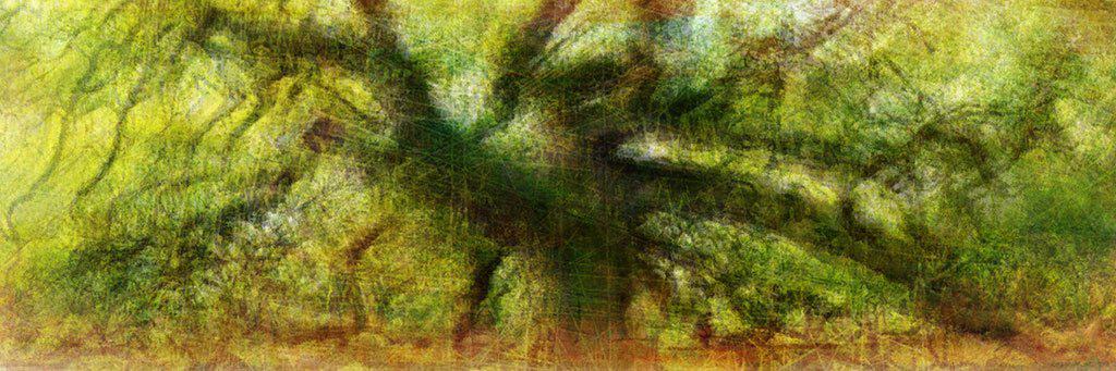 Een prachtig schilderij van groot hout met dicht gebladerte. Levendige kleuren en een bijzondere tekentechniek maken deze foto van een eenvoudige boom heel bijzonder.