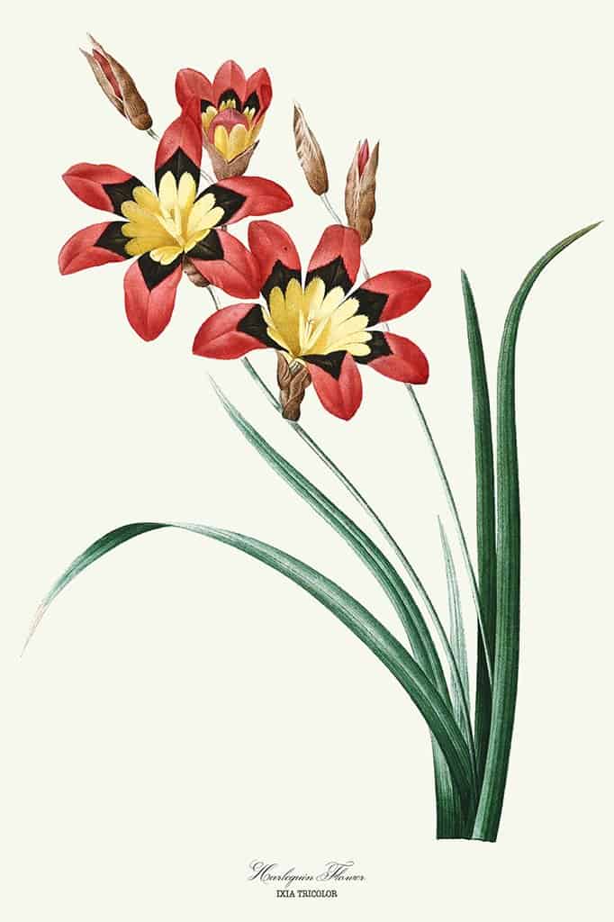 Harlekijnbloemen (Ixia Tricolor), ook wel bekend als dwaalbloemen, zijn twee- of driekleurig met een gouden centrum en een kleine ring van bruin omgeven door een andere kleur.