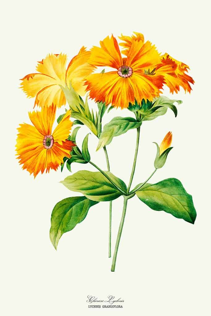 Oude foto's uit leerboeken en tijdschriften kunnen een mooi decor worden voor het interieur! Deze illustratie van Chinese Lychnis (Lychnis Grandiflora) heeft een retro chic en ziet er geweldig uit in een modern of klassiek interieur.
