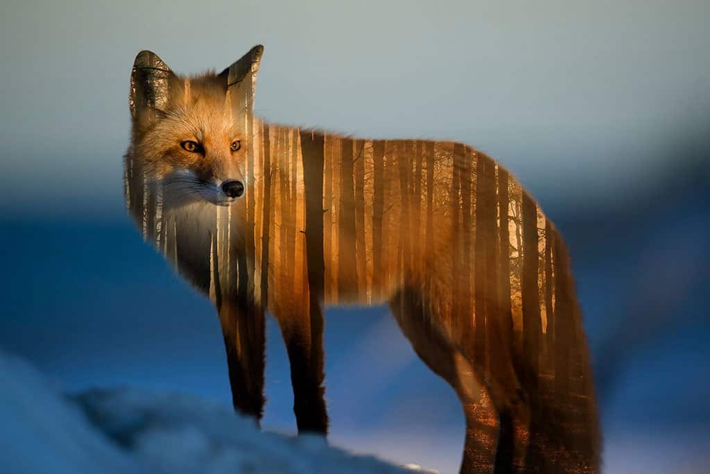 Een geweldige fotoshoot van een vos met een dubbel belichtingseffect. Vossen zijn actief in alle seizoenen. Op de foto ziet u het dier in de winter, wanneer het waarschijnlijk op zoek is naar een prooi. Maar je kunt ook een weerspiegeling zien van zijn natuurlijke habitat - een bos - in de zomer.