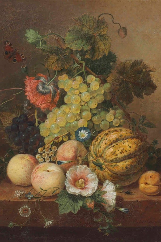 Druiven perziken, meloen en een abrikoos op een marmeren randje - Eelke Jelles Eelkema