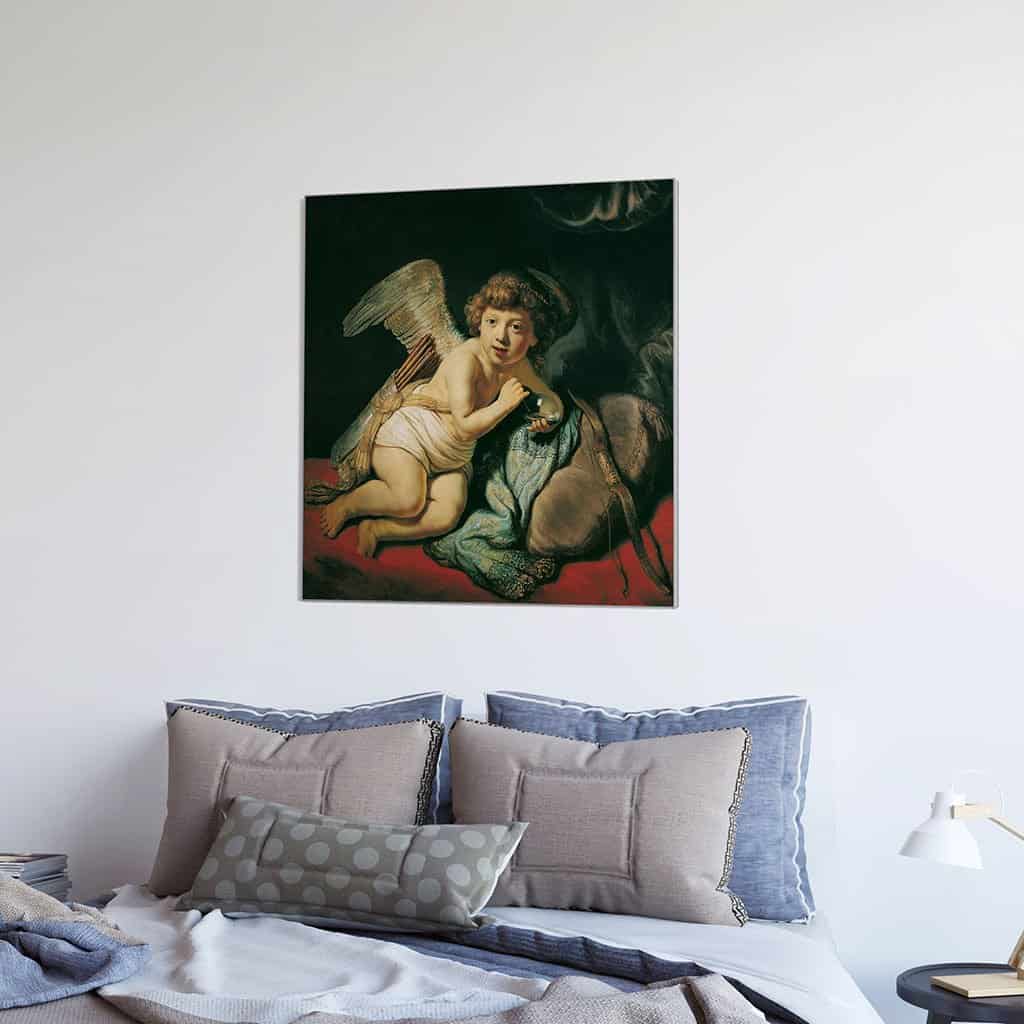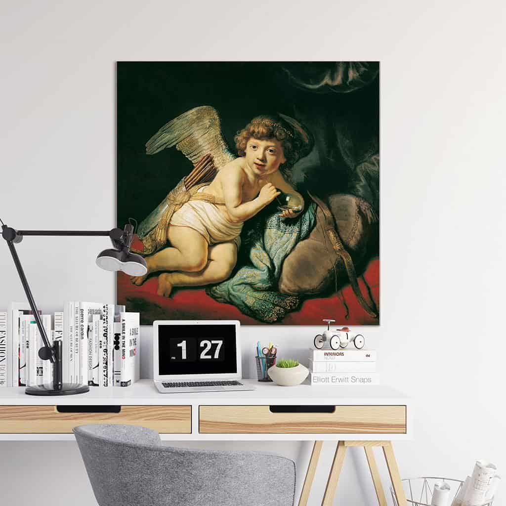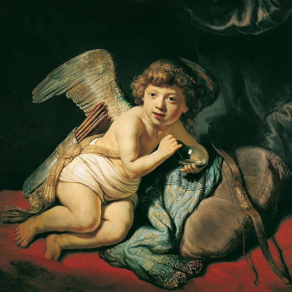 Een verbazingwekkende vakkundig geschilderde "Cupido Blowing a Soap Bubble" van Rembrandt. De Cupido is afgebeeld met een luchtbel, niet toevallig. Vanuit een bepaald oogpunt vertegenwoordigt Cupido een voorbijgaande en kortstondige fase van het menselijk leven.