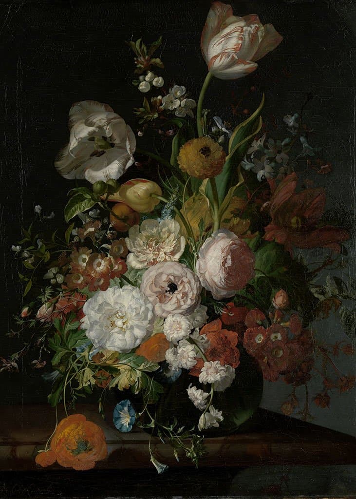 Stilleven met bloemen in een glazen vaas (Rachel Ruysch)