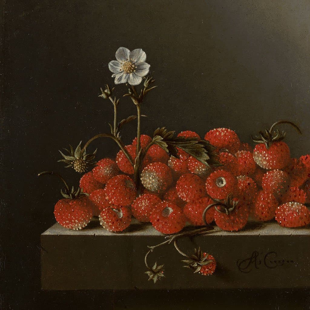 Dit kleine stilleven is een wonder van eenvoud. Op een stenen tafel staan enkele aardbeien op een donkere achtergrond. Een takje hangt over de rand van een witte bloem die uit de vrucht steekt. Een steeltje hangt over de rand en een witte bloem steekt uit de vrucht. De zaden van de rode aardbeien worden aangegeven met stippen witte verf.