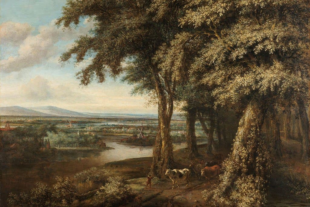 Philips Koninck - een leerling van Rembrandt - nam een hoog standpunt in. Hij plaatste de eerste paar majestueuze bomen dik geschilderd in bruingroene tinten. Verder terug leidt een kronkelende rivier het oog naar de verte, gedomineerd door koelere kleuren.