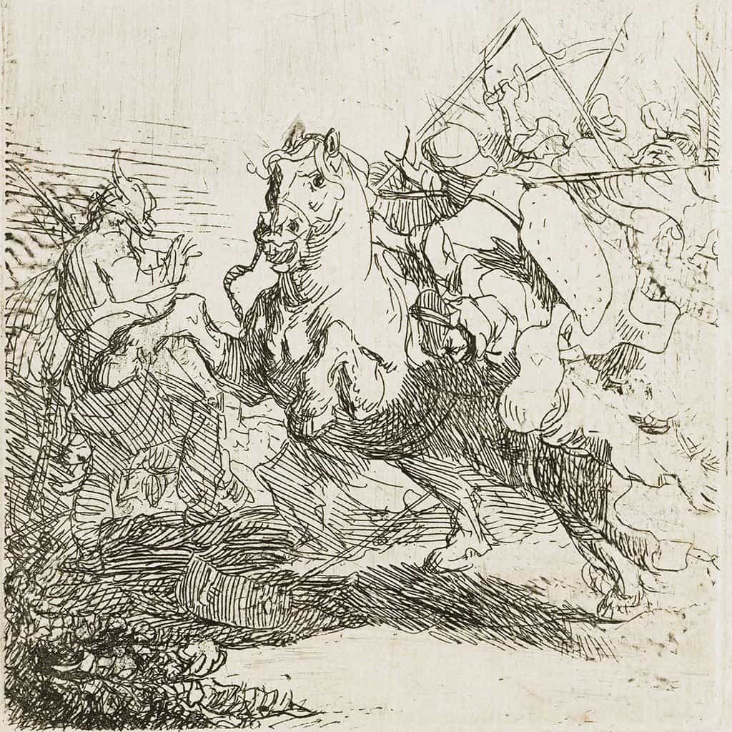 De "Cavalerie Slag" is een van Rembrandts prachtige etsen op papier. De kunstprent zal een mooie aanvulling zijn op uw interieur!