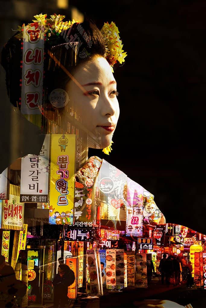 De oogverblindende kunstprent met geisha's die de moderne Japanse stadslichten weerspiegelen, zou een zinvolle aanvulling worden op je interieur. Zoals de stijl? Bekijk meer dubbele belichtingskunst in de speciale collectie!