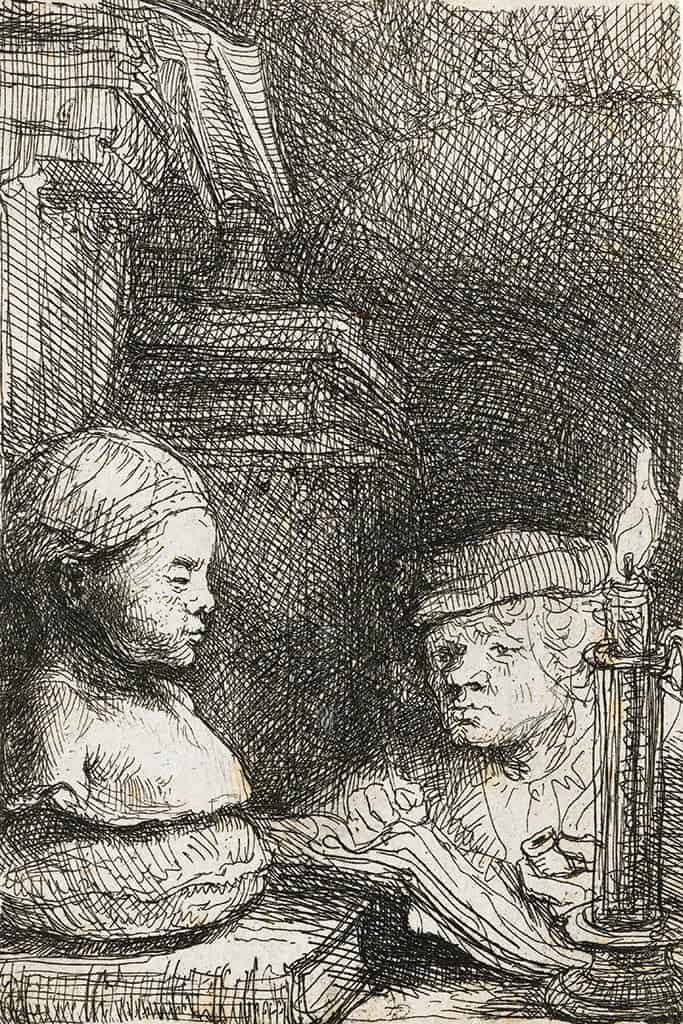 Op deze ets heeft Rembrandt een tafereel afgebeeld, dat hij met eigen ogen kon aanschouwen. Een man tekent het hoofd van een meisje bij kaarslicht. Het schilderij geeft een indruk van de atelierpraktijk van de zeventiende eeuw. Tekenen van beelden of gipsen afgietsels waren een veelvoorkomend onderdeel van de artistieke opleiding. Pas nadat hij het onder de knie had, mocht de jonge kunstenaar tekenen naar een levend model.