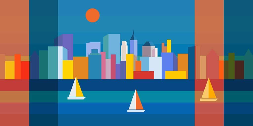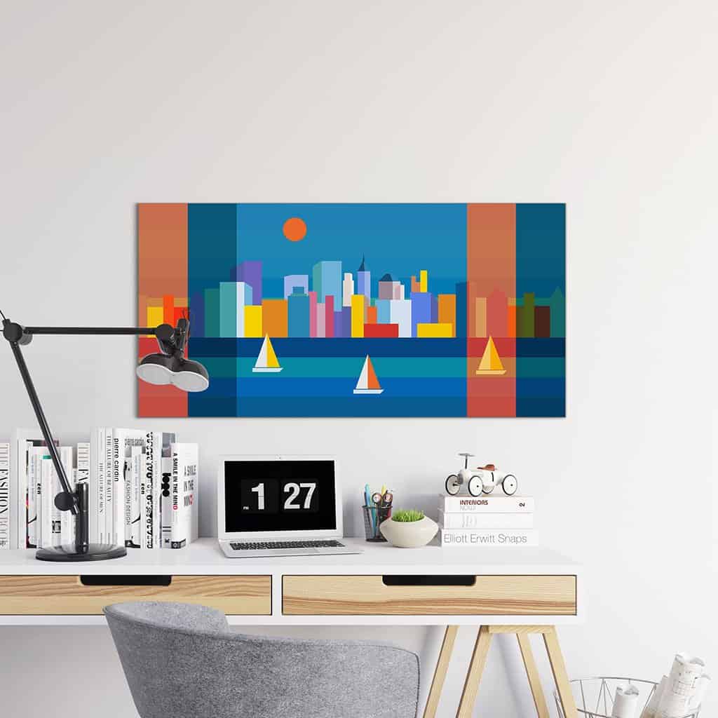 Op zoek naar een koele en heldere minimalistische poster? Het is onmogelijk om niet verliefd te worden op deze geweldige kunst. Het stadsbeeld aan de kust is enorm en gezellig door de prachtige levendige kleuren.