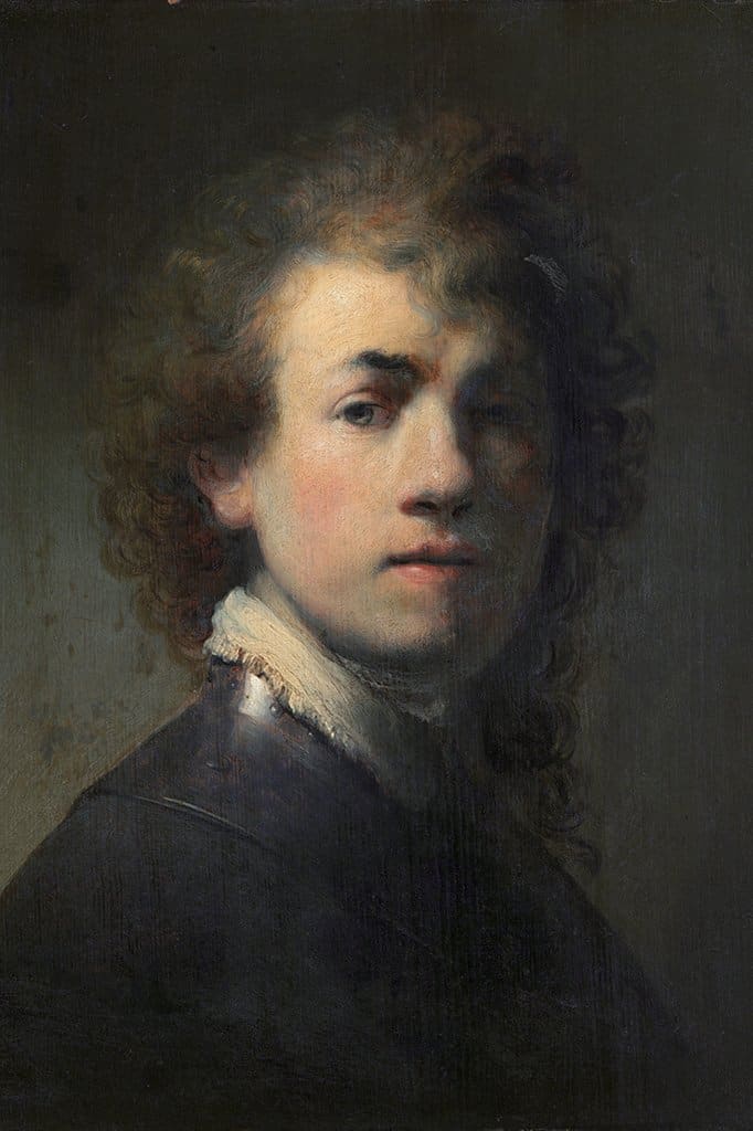 Dit zelfportret toont een borstbeeld van Rembrandt, kijkend naar de kijker. Hij draagt een nek, een deel van een harnas dat de nek beschermt, met een witte kraag eroverheen. Hij heeft een weelderig haar met een kapsel aan de rechterkant.