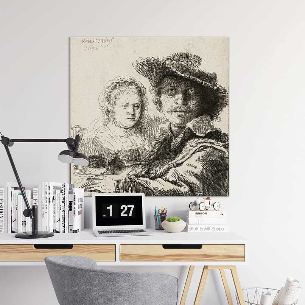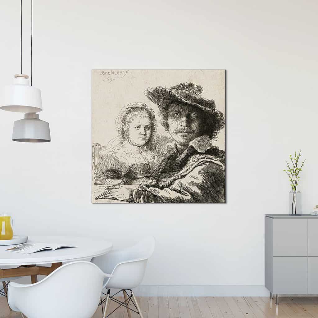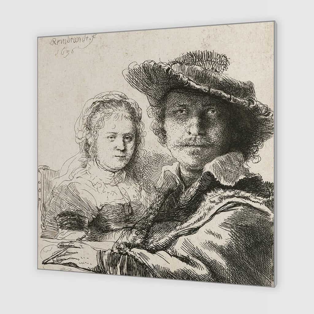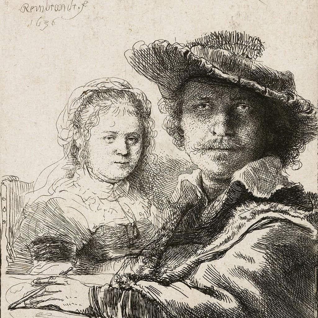 In zijn gravure "Zelfportret met Saskia" uit 1636 zijn Rembrandt en zijn vrouw in historische kleding afgebeeld. De kunstenaar draagt een charmante 16de-eeuwse baret en een bontjas, terwijl Saskia een ouderwetse sluier draagt. Deze spelactie was niet ongebruikelijk voor Rembrandt.