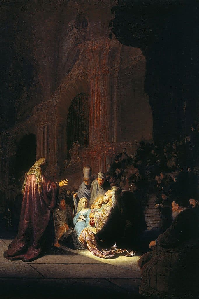 Jozef en Maria zijn in de tempel om hun pasgeboren kindje Jezus aan God op te dragen. Simeon zag dat het kind de verwachte Messias zou kunnen zijn. De oude man neemt hem in zijn armen en barst uit in een lofzang. Het goddelijke licht dat Simeon overstroomt, lijkt van het kind zelf te schijnen.