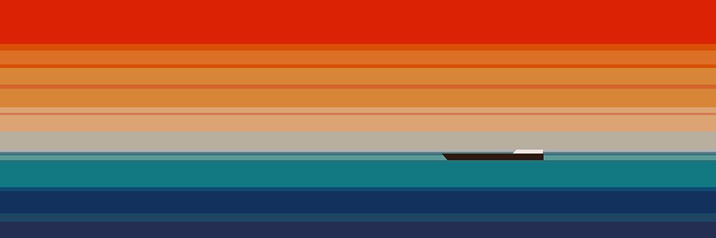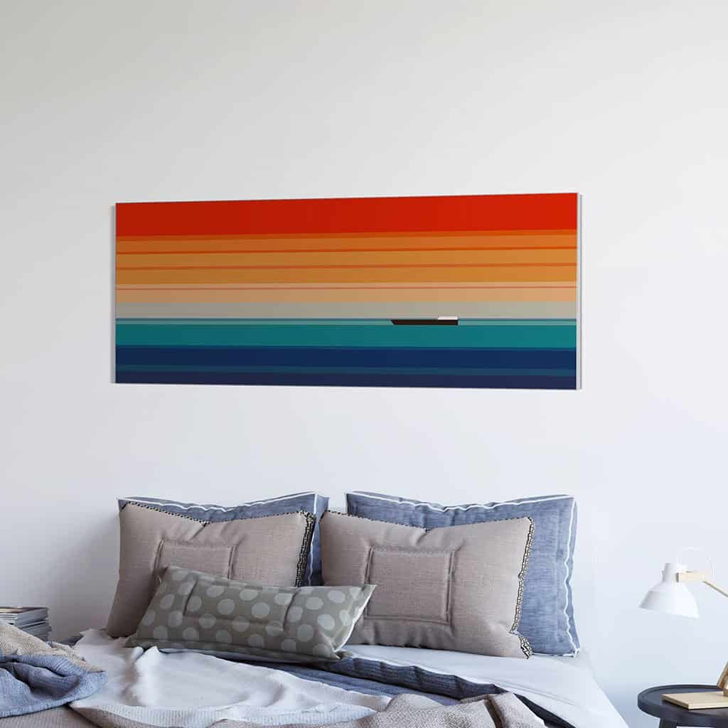 Een minimalistisch plat ontwerp met een super panorama van een landschap met een boot in een eindeloze oceaan. Simpel, buе awesome, de kunstprint zou een prachtig helder accent worden voor je Woonkamerofgang.
