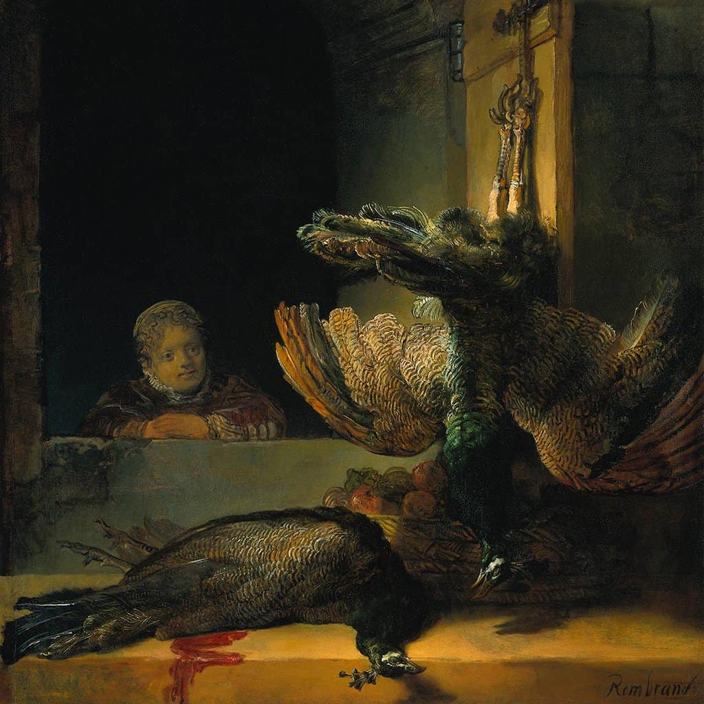 Een angstaanjagende scène, nietwaar? In de tijd van Rembrandtwaren pauwen een delicatesse voor rijke mensen. Na het slachten van de vogels werden ze ondersteboven opgehangen om het bloed af te voeren, zoals Rembrandt op dit kunstwerk schilderde.