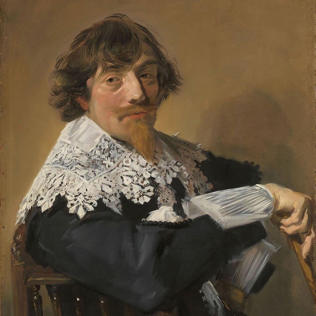De man zit zijwaarts, met zijn arm rustend op de rugleuning van zijn stoel. Het lijkt alsof hij zich net heeft omgedraaid om naar een onverwachte bezoeker te kijken. Zijn rechterhand past maar net in het beeldvlak. De geportretteerde man is Nicolaes Hasselaer. Hij was een Nederlandse Gouden Eeuwse brouwer en majoor van de Amsterdamse schutterij.