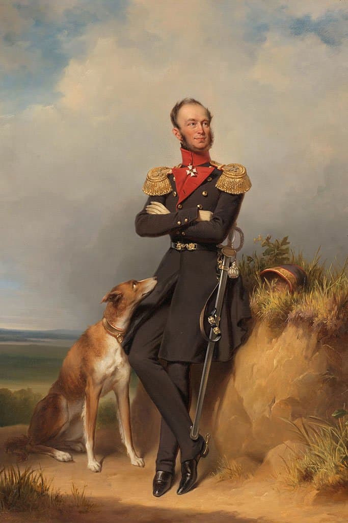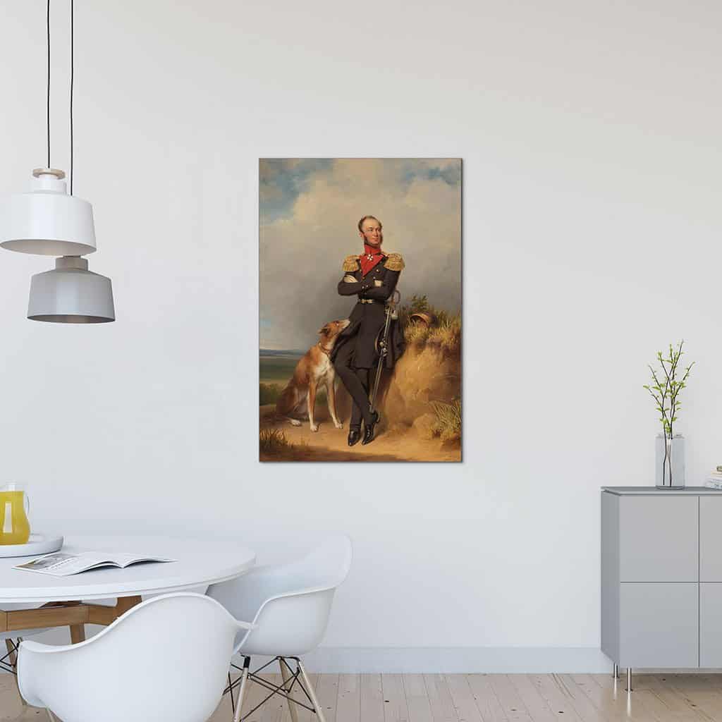 Dit is een portret van koning Willem II in militair uniform, maar met een uitgesproken informele sfeer. Begeleid door zijn hond poseert hij nonchalant in de duinen, die in de Romantiek als het typisch Hollandse landschap werden beschouwd. In 1848 - toen er in heel Europa revoluties woeden - zag Willem II af van koninklijke autocratie en werd Nederland een parlementaire democratie.