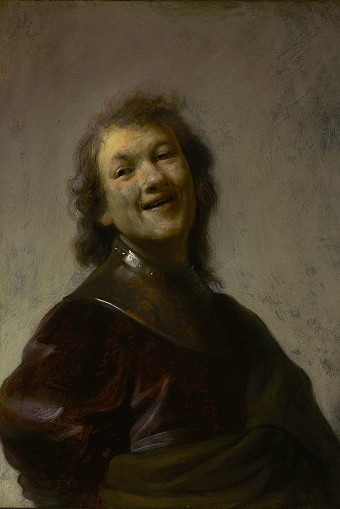 Rembrandt was geïnteresseerd in het uitdrukken van menselijke emoties en schilderde zichzelf vaak in de beginjaren van zijn werk als zelfstandig meester in Leiden. Hier, in een klein en vrij geschilderd werkje, verschijnt hij als soldaat, ontspannen en lachend.