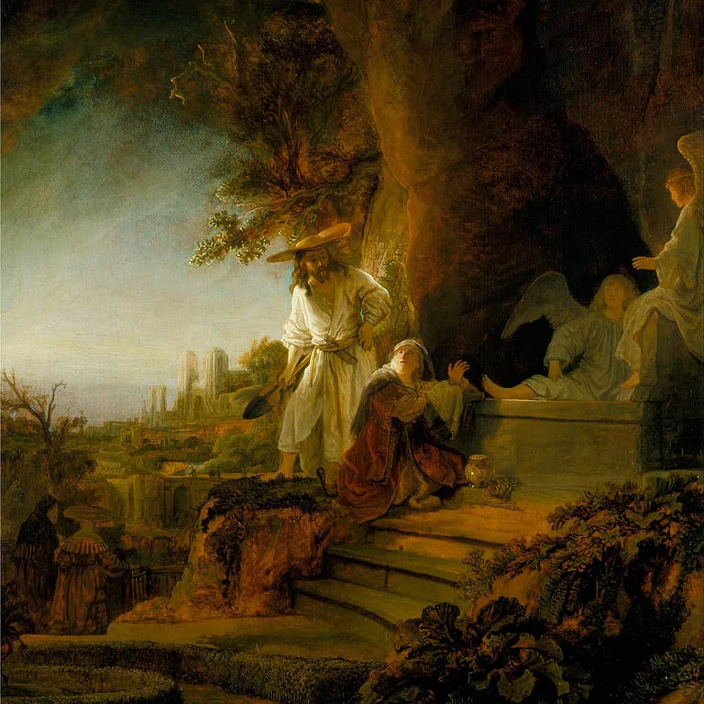 De plot is ontleend aan het Evangelie van Johannes. Christus draagt een schop en draagt een brede strohoed. Dit is een traditionele hint in de kunst die Magdalen hem als tuinman herkent. Het werd voor het eerst gepubliceerd in 1660 in de dichtbundel De Hollantsche Parnas, die enkele verwijzingen naar Rembrandt bevatte.