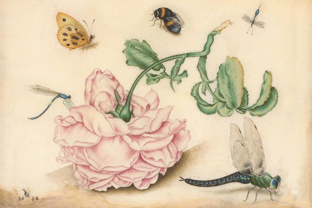 Het stilleven van Christoffel van den Berghe bestaat uit één enkele bloesem. De grote lichtroze roos is met de voorzijde naar beneden gericht. Zou dit een verwijzing kunnen zijn naar de vergankelijkheid van al het aardse leven?