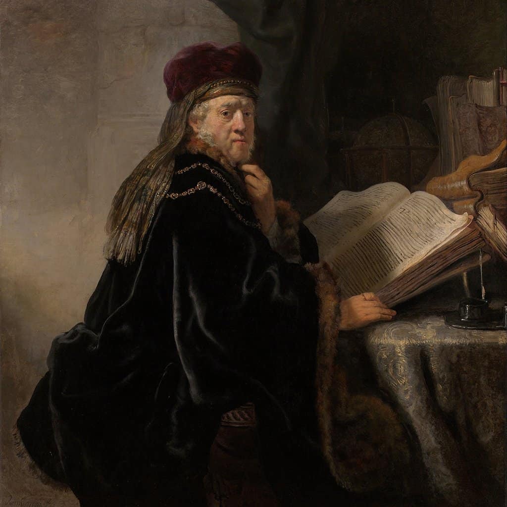 Hij schilderde honderden prachtige kunstwerken, waaronder tientallen portretten. "Geleerde, zittend aan een tafel met boeken' is een schitterend voorbeeld van zijn vaardigheden.