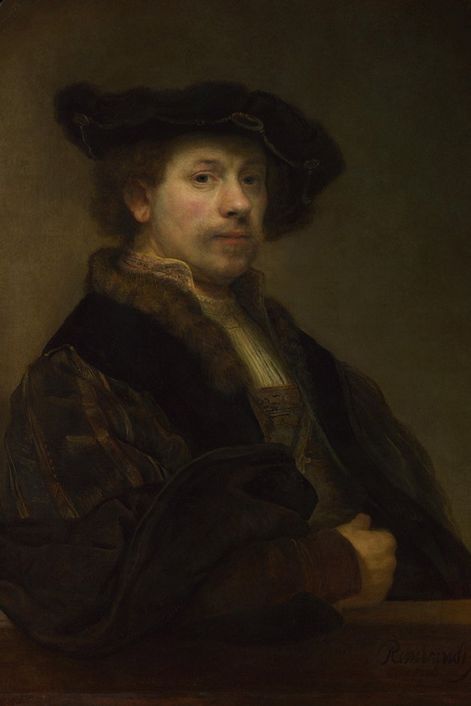 Onder de tientallen zelfportretten die Rembrandt schreef, valt dit portret op door zijn monumentaliteit. Rembrandt laat er zijn maatschappelijke positie op zien. Hij is gekleed in rijke kleren met bont, een massieve ketting en juwelen. De blik is melancholiek, met een bewustzijn van zijn waardigheid.