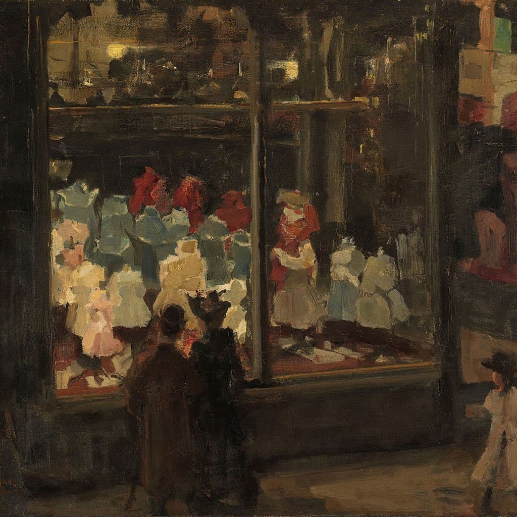 Het schilderij toont een stel dat naar kinderen kijkt in de verlichte etalage van het modetijdschrift Bahlmann & Co. op de Nieuwendijk in Amsterdam. De jurken zijn netjes gerangschikt op kleur, waardoor er diagonale stroken van rood, lichtblauw en wit ontstaan. Dit verlichte raam was nieuw aan het eind van de 19e eeuw en werd mogelijk gemaakt door de introductie van het elektrische licht. Dat maakte de stad 's nachts veiliger, maar ook levendiger.