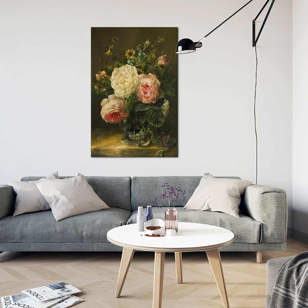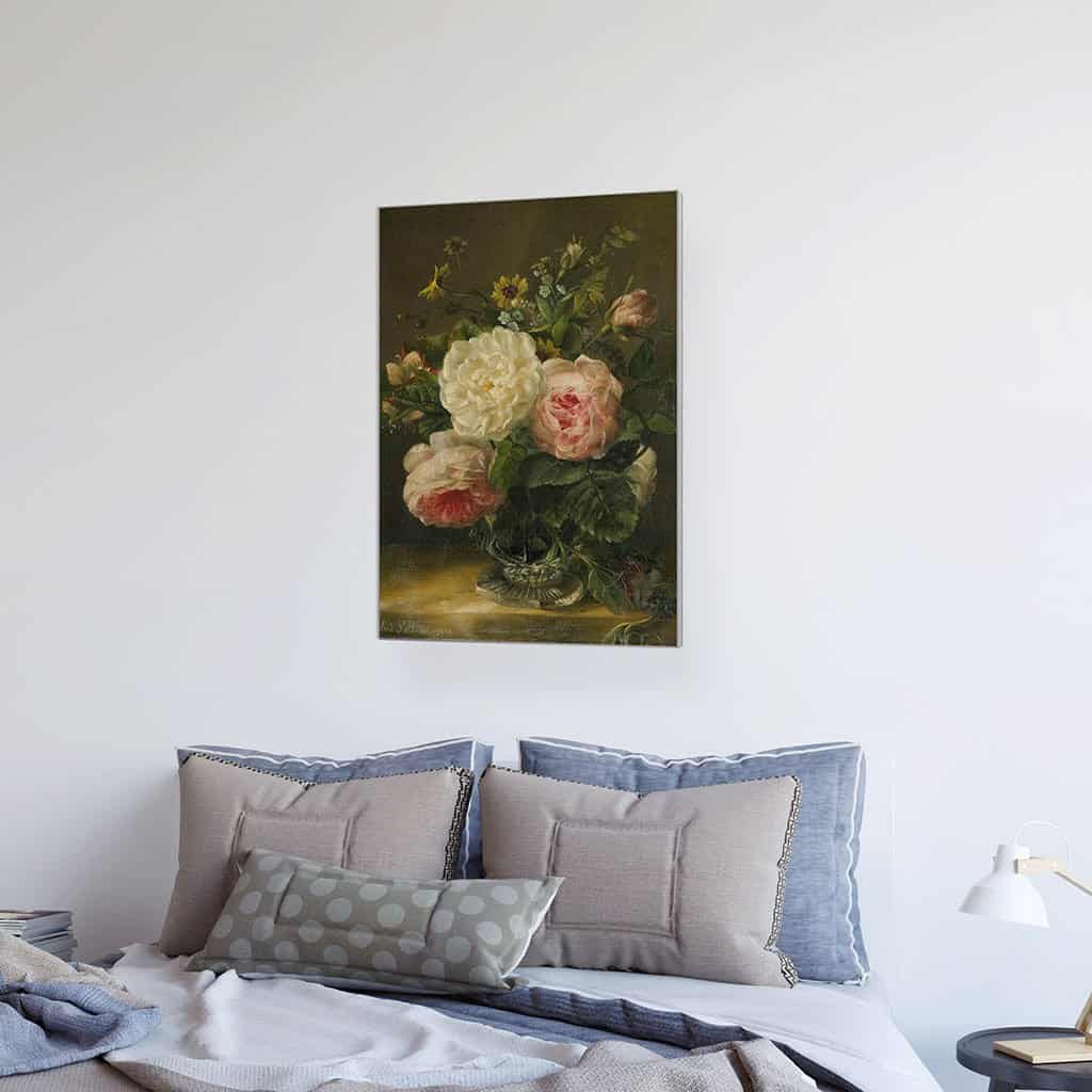 Stilleven met bloemen in een kristallen vaas. Een boeket rozen, vergeet-me-nietjes en andere bloemen in een vaas van geslepen kristal op een tafel. De poster zal een mooie decoratie zijn voor elke woonkamer, slaapkamer of kantoor.