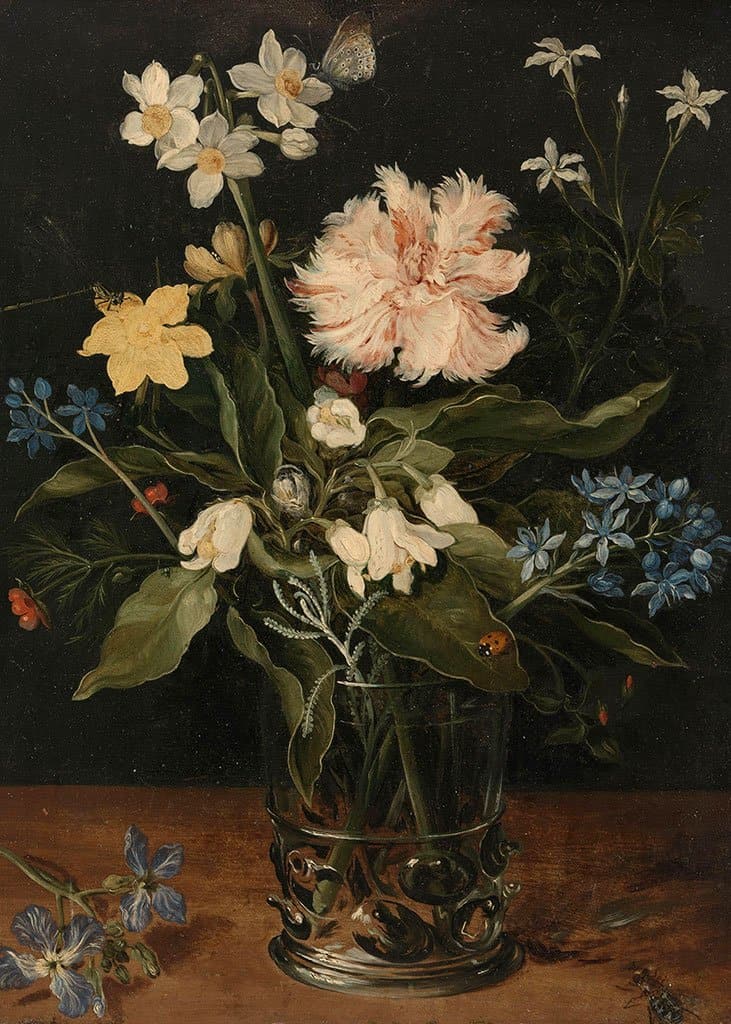 Zoveel bloemen in zo'n klein glas water! Dit moet een zeer overdadige indruk hebben gemaakt op een 17de-eeuwse kijker. Bloemen waren duur, tuinen bevatten slechts kleine bloemen, omgeven door groen. Jan Brueghel II was een trouwe navolger van zijn vader Jan Brueghel I. Dit sprankelende stilleven is een variatie op een schilderij van zijn vader.