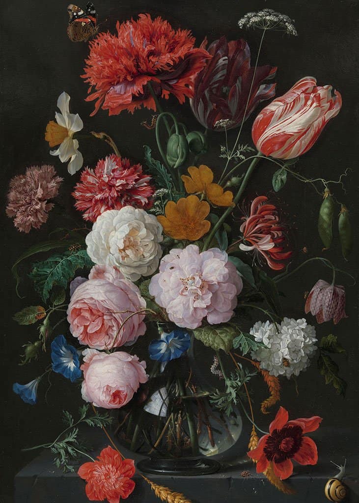 Dit stilleven omvat naast een veelheid aan kleurrijke bloemen ook verschillende bewoners van wilde dieren. Dit weelderige boeket bevat onder andere: tulp, narcissenbos, anjer, ochtendglorie, roos (wit en roze), tarwe, koeienpeterselie, opium, zoete erwt, hondsroos, kamperfoelie, rode anemoon en een hortensia. Het origineel is te zien in het Rijksmuseum.