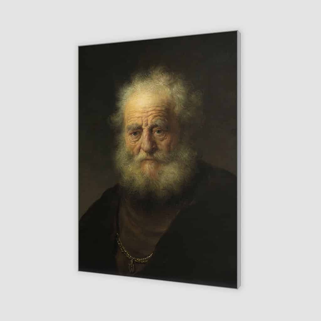 Rembrandt schilderde gedurende zijn hele carrière meesterlijk portretten, die zijn karakter overbrengen door middel van dramatische kostuums en verlichting. Hier staan de rotsachtige eigenschappen van de oude man in schril contrast met zijn wereldse attributen: een gouden ketting, een stalen bult en een gevederde baret.