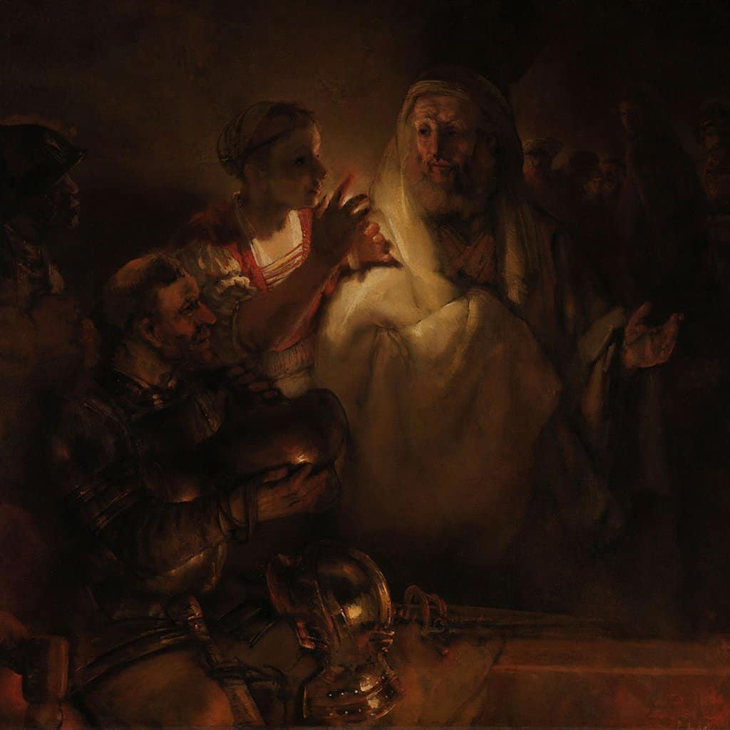 In dit nachtelijke tafereel, verlicht door een kaars, wordt Petrus door soldaten herkend als een discipel van Christus. Hij ontkent dit echter, maar hij ontkent dit, door zijn meester te verloochenen. Christus, in de duistere rechterachtergrond, kijkt terug op Petrus, terwijl hij wordt weggeleid door soldaten.