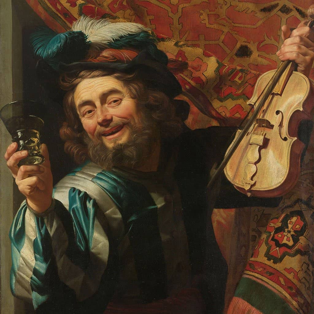"The Merry Fiddler" verbeeldt een man in extravagante Italiaanse kleding. Hij komt van achter een wandtapijt en leunt uit het raam. Om in contact te komen met de toeschouwer zoekt hij contact. Het lijkt erop dat deze vrolijke vioolspeler het schilderij wil verlaten en zich bij de toeschouwer wil voegen.