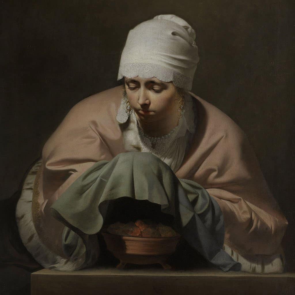 De jonge vrouw verwarmt haar handen boven een schotel van gloeiende kolen. Zij verpersoonlijkt de winter. Dit seizoen werd meestal voorgesteld als een armoedig geklede oude man of vrouw: oud omdat het jaar ten einde loopt, en arm omdat er in de winter geen gewassen groeien. De keuze van Van Everdingen voor een jonge, rijk geklede vrouw is dan ook vrij ongewoon.