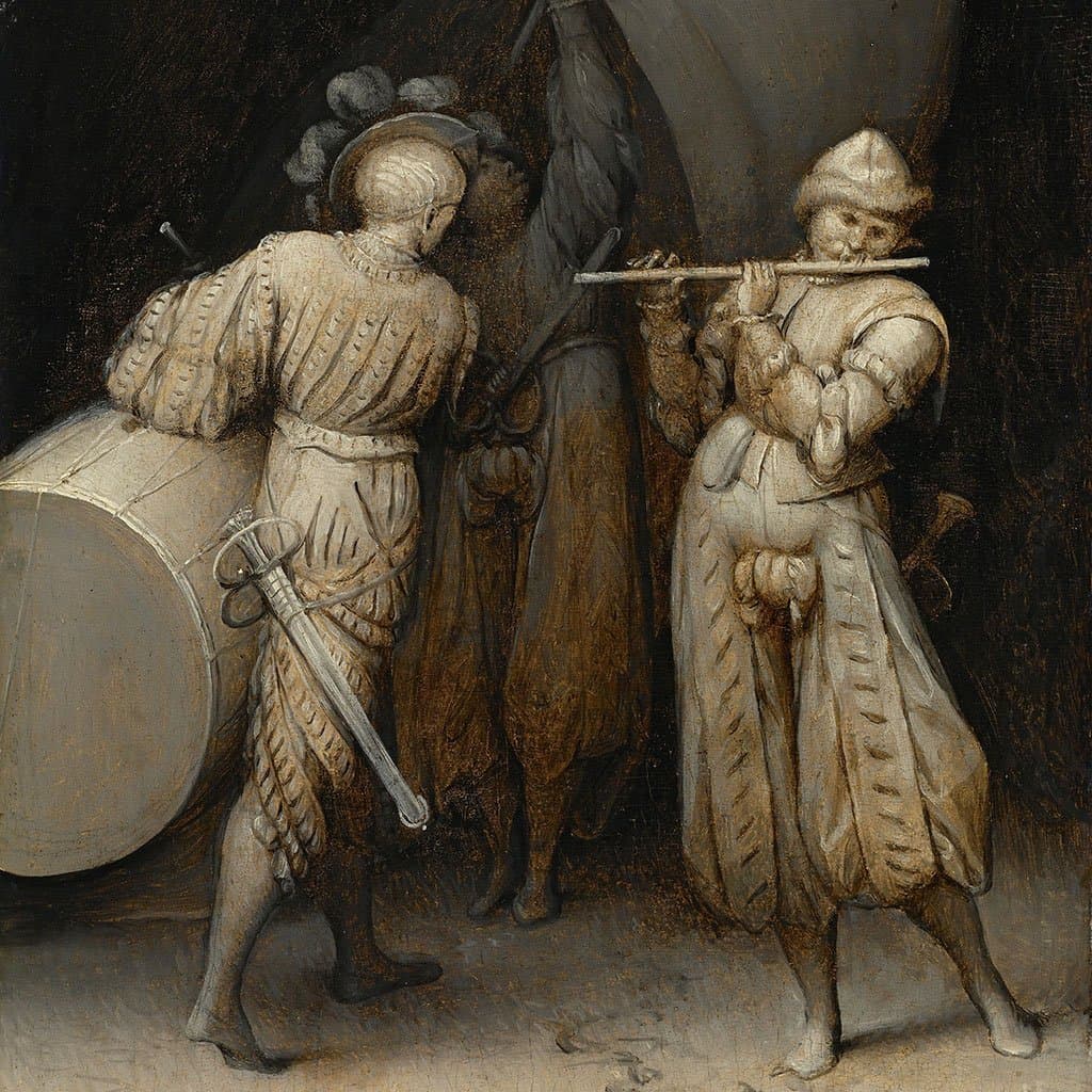 Dit kunstwerk is daarom eigenlijk a-typisch Bruegel. Geschilderd op paneel in 1568 stelt het een trio "Landsknechte" - oftewel - huursoldaten voor. Vanwege hun pittoreske uniformen waren dit soort soldaten populaire afbeeldingen voor makers van prenten.