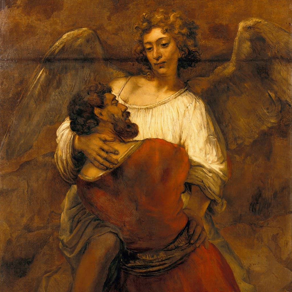 s Nachts krijgt hij ruzie met een mysterieuze man, waarschijnlijk een engel. Jakob en de engel worstelen de hele nacht, maar de engel kan niet winnen. Bij het aanbreken van de dageraad geeft hij het op en zegent Jakob. Hij geeft hem ook de ere-naam Israël: "Iemand die bij God heeft gezegevierd".