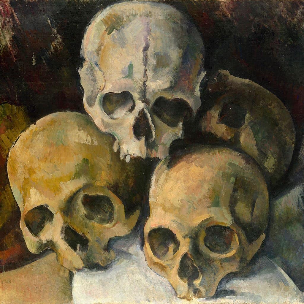 Dit schilderijvan Paul Cezanne is zeer suggestief. Er zijn vier menselijke schedels gestapeld in een piramidale configuratie, waarvan er drie direct vanaf het schilderij naar voren gericht zijn. Dit wekt de indruk dat ze de kijker aanstaren. Angstaanjagend!