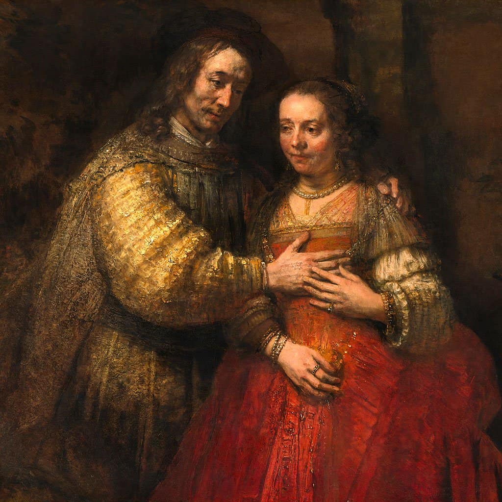 "De Joodse bruid" is een van Rembrandts bekendste werken. De identiteit van het echtpaar is een mysterie. Is het een oudtestamentisch echtpaar? Of gewoon een dubbelportret? Misschien staat er een joodse vader op afgebeeld die zijn dochter op haar trouwdag een halsketting presenteert.