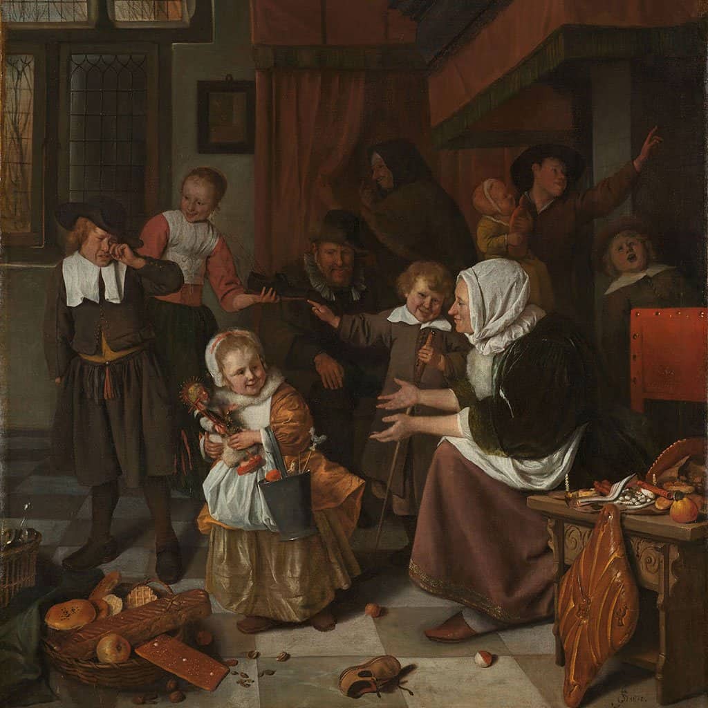 In "Het Sinterklaasfeest" van Jan Steen zien we een typisch Nederlandse scène. Het meisje was zichtbaar erg blij met haar geschenk. Maar naast deze vrolijkheid zien we een jongen die minder begaafd is. Hij vond niets in zijn schoen. Dat betekent dat hij zich dat jaar niet zo goed gedroeg.