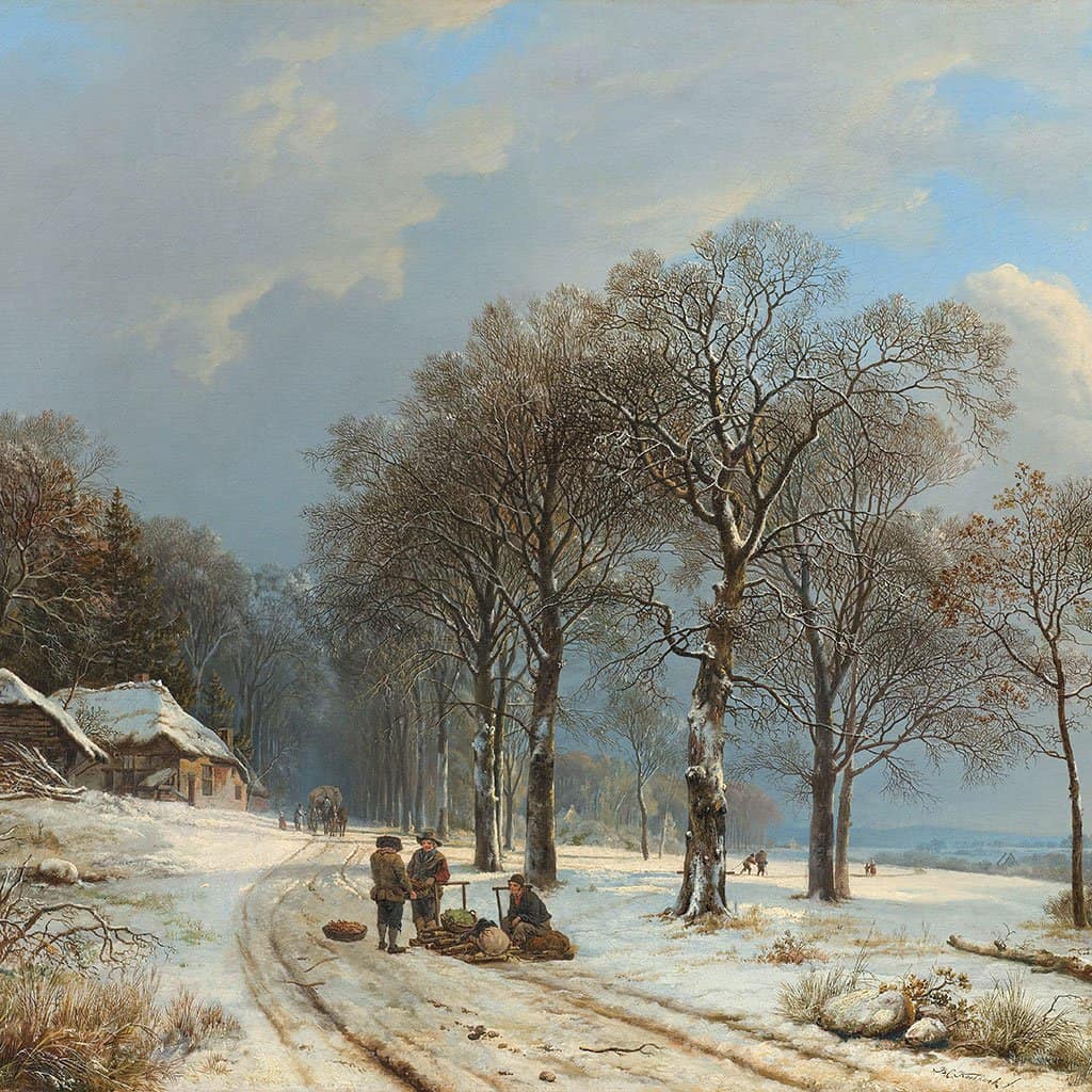Barend Koekkoek koos voor dit winterlandschap voor een heuvelachtig landschap in Gelderland en de Duitse Nederrijn. In tegenstelling tot zijn indrukwekkende bosgezichten is dit een rustig schilderij. In de verte zien we een mistig panorama. Het schilderij toont de serene natuur op een winterse dag, een wereld bedekt met de zuiverheid van sneeuw.
