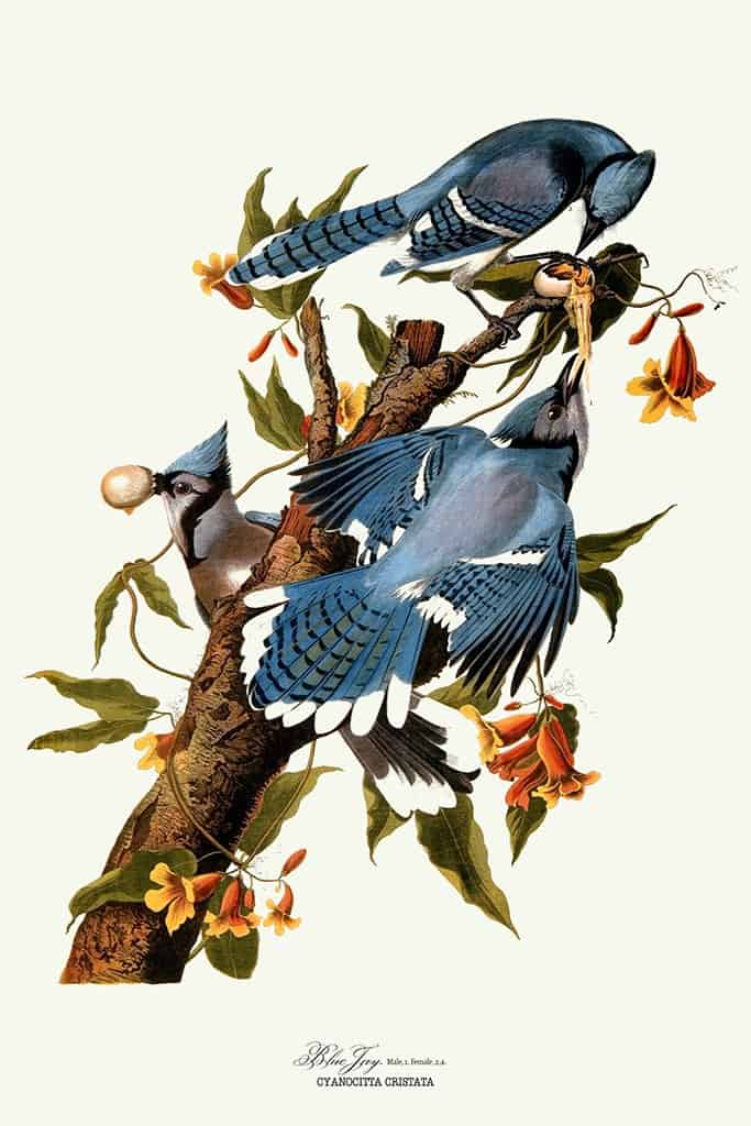 Blue Jay (Cyanocitta cristata) illustratie door John James Audubon. De foto is genomen uit zijn beroemde ornithologische werk "Birds of America".